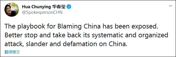 隨后,華春瑩再發(fā)一條推文:“指責中國的劇本已被曝光,最好停止針對中國有計劃、有組織的攻擊、詆毀和誹謗!